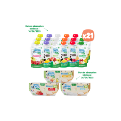 Gói tráng miệng trái cây: 18 bầu trái cây 100g hữu cơ cho bé từ 4 tháng + 3 gói 4 bát 100g trái cây quấy hữu cơ cho bé từ 6 tháng .