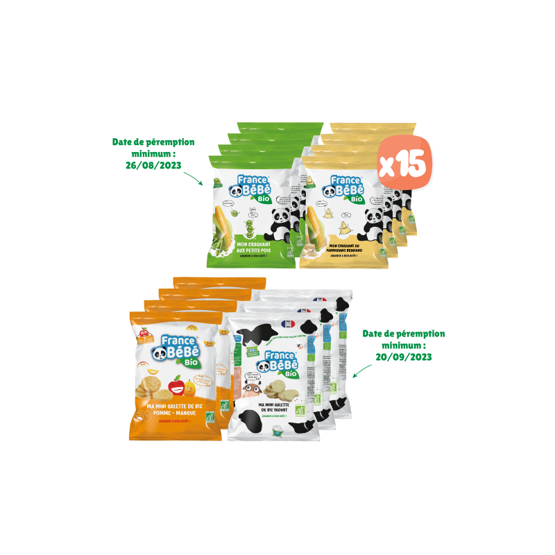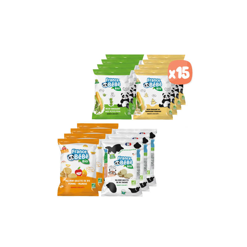 4 gói thanh bắp phô mai parmesan hữu cơ , 4 gói đậu ngô hữu cơ , 4 gói bánh dẻo xoài táo , 3 gói bánh tráng sữa chua mini .