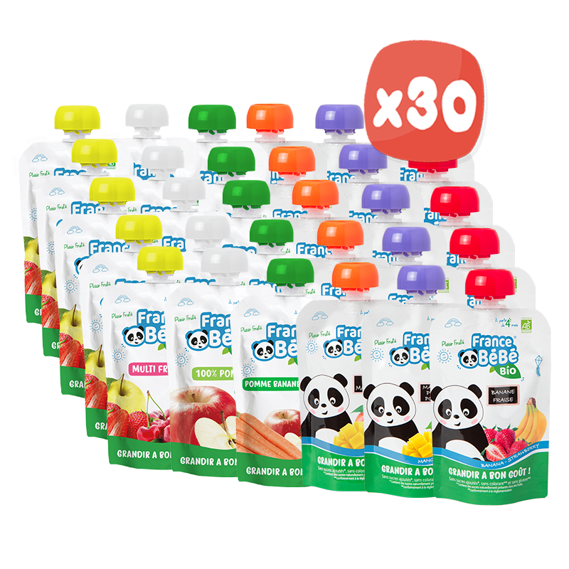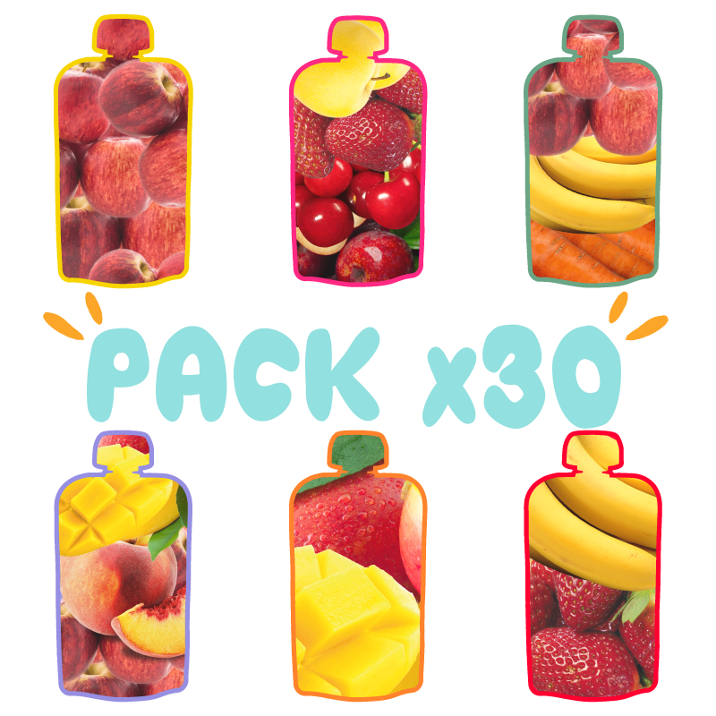 30 túi trái cây hữu cơ đa dạng cho bé từ 4 tháng tuổi gồm: 5 túi táo , 5 túi chuối cà rốt táo , 5 túi bí , 5 bầu xoài , 5 túi chuối dâu , 5 túi xoài đào táo .